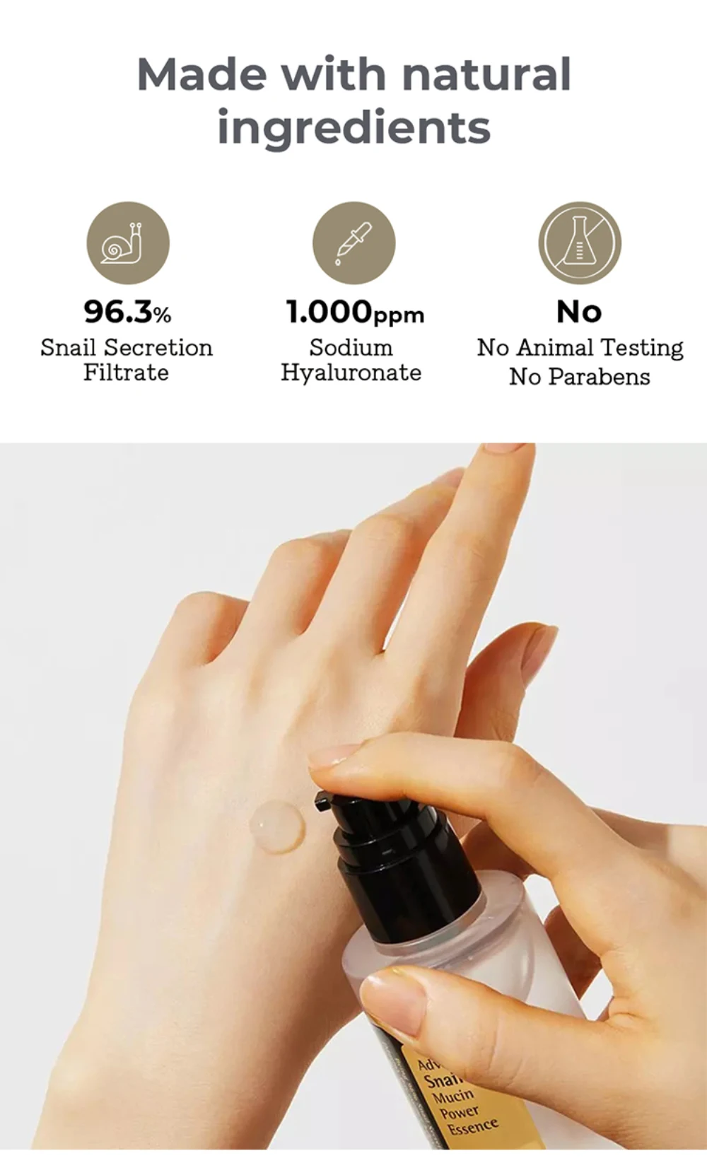 - Advanced Snail Mucin 96% Power Repairing Essence: The Snail Mucin Formulated with 96% Snail Secretion Filtrate, this essence repairs and rejuvenates the skin from dryness and aging